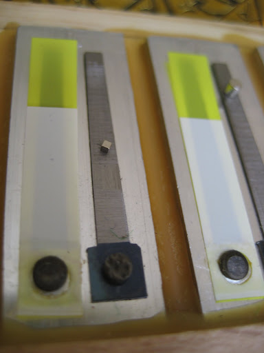 C'est là que ça devient intéressant! Pour entendre le son de chaque lame, souffler dedans pas trop fort (important). ATTENTION une note poussée est jouée en inspirant, et vice-versa (et oui, il faut penser qu'on est à l'intérieur du soufflet...). On va changer la fréquence en y ajoutant un micro-aimant comme ci-dessous.Plus on met l'aimant près de l'extrémité libre de l'anche, plus la fréquence va baisser (la note sera plus grave). Il suffit donc de poser l'aimant, de faire vibrer la lame en soufflant dans le trou, et de le déplacer suivant la fréquence voulue (utiliser un accordeur, sinon c'est galère).